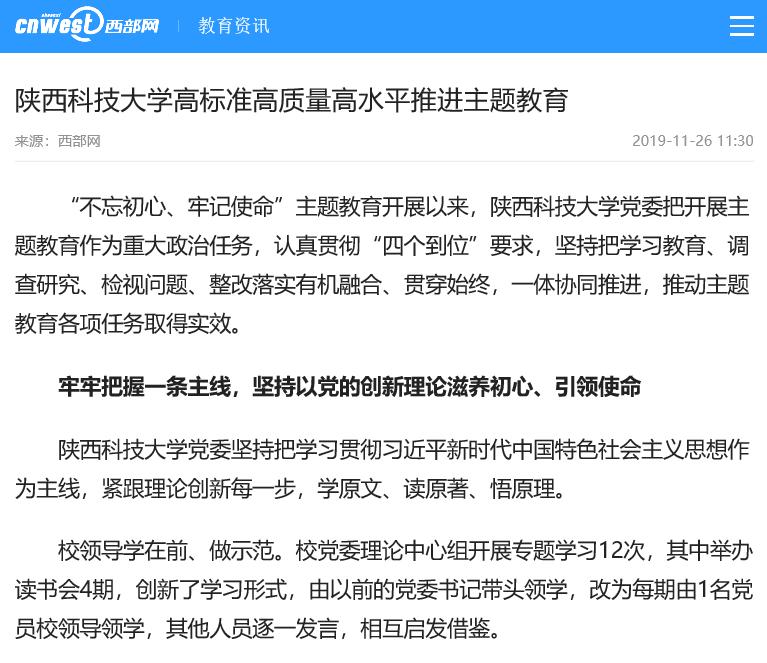網(wǎng)易新聞:陜西科技大學(xué)高標(biāo)準(zhǔn)高質(zhì)量高水平推進(jìn)主題教育