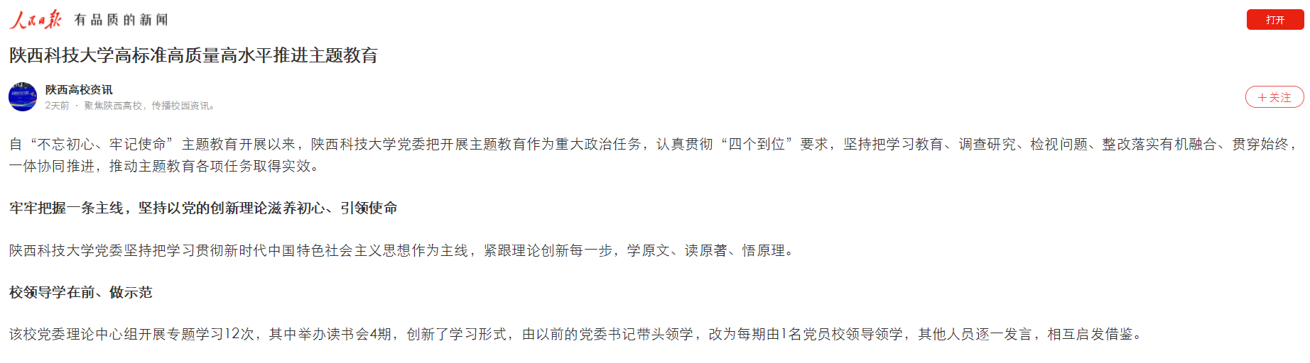 人民日報:陜西科技大學(xué)高標(biāo)準(zhǔn)高質(zhì)量高水平推進(jìn)主題教育