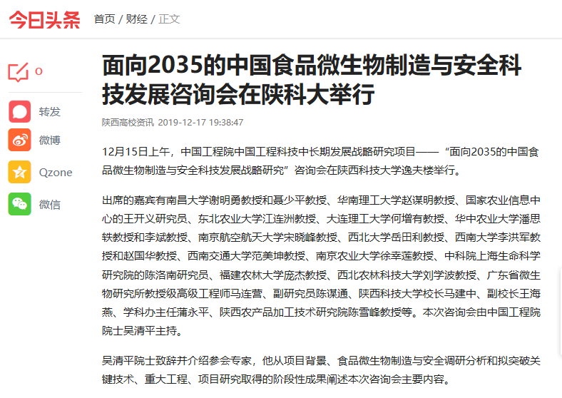 今日頭條:面向2035的中國食品微生物制造與安全科技發(fā)展咨詢會在陜科大舉行
