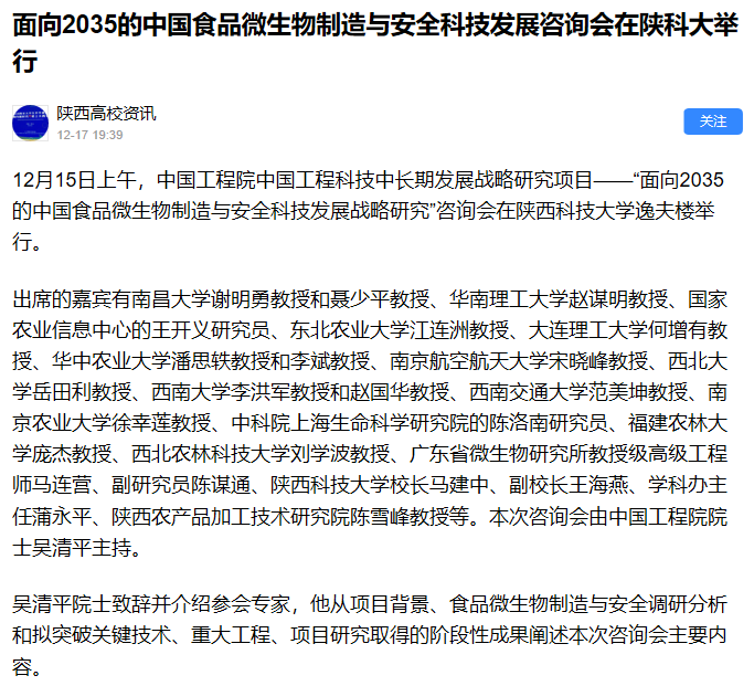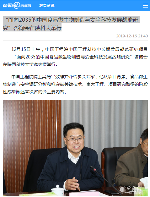 近日,中國教育網(wǎng)、西部網(wǎng)、今日頭條等媒體紛紛報(bào)道面向2035的中國食品微生物制造與安全科技發(fā)展戰(zhàn)略研究”咨詢會在陜西科技大學(xué)舉行。