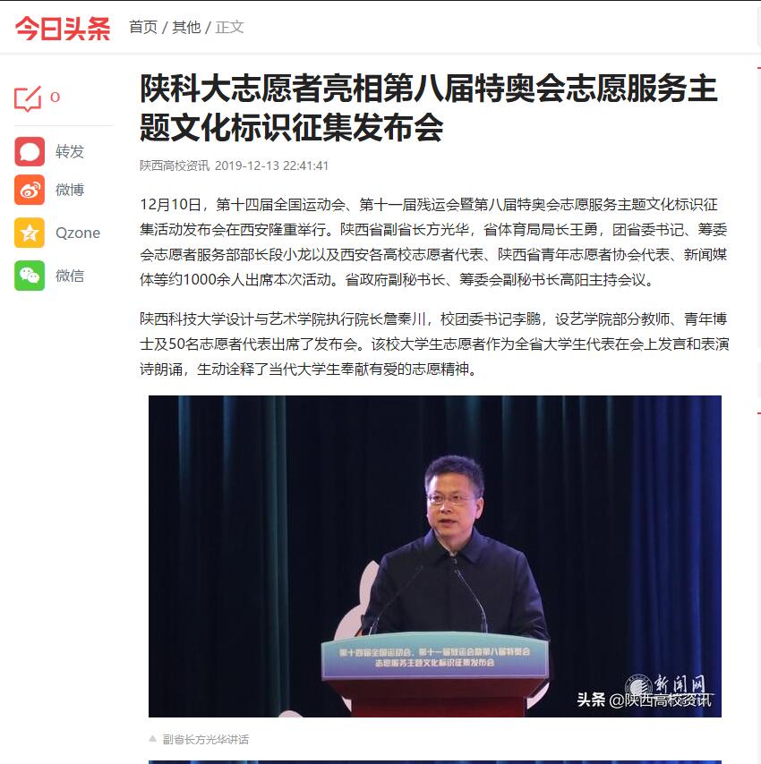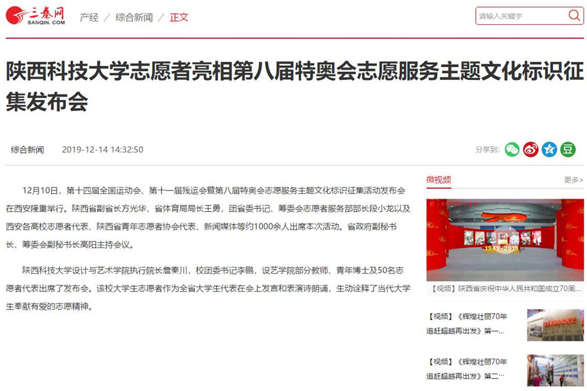 近日,百度APP、三秦網(wǎng)、人民日報APP等媒體紛紛報道我校志愿者亮相第八屆特奧會志愿服務主題文化標識征集發(fā)布會。