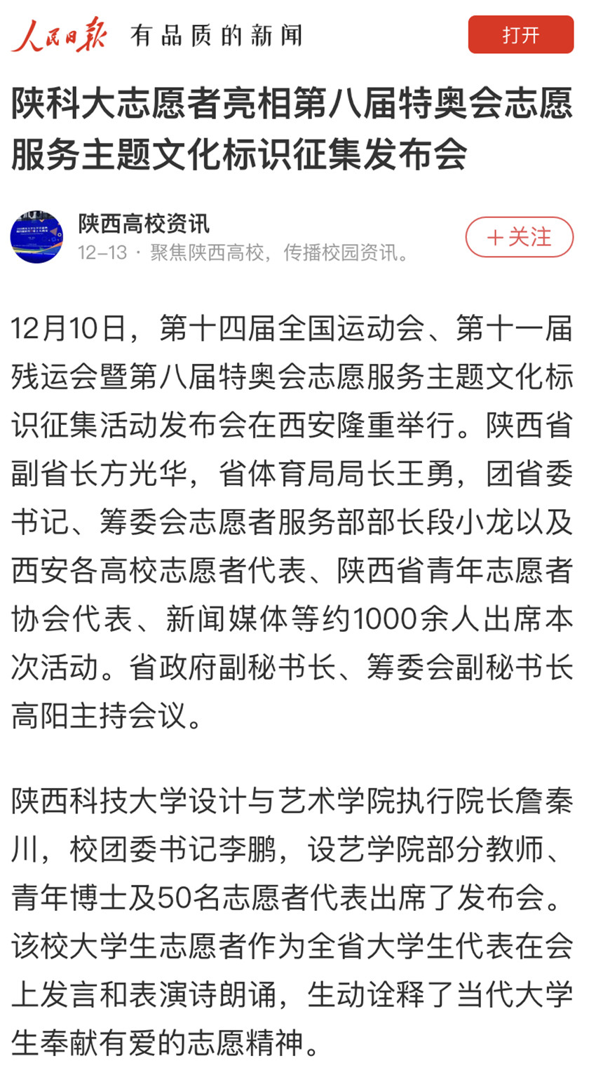 人民日報APP:陜科大志愿者亮相第八屆特奧會志愿服務主題文化標識征集發(fā)布會