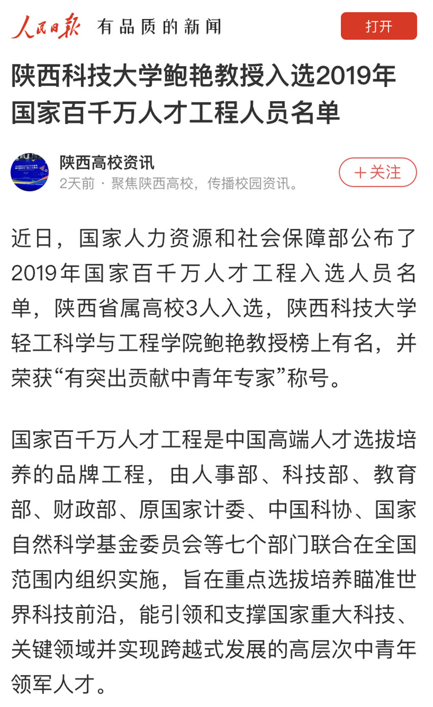 人民日報APP:陜西科技大學鮑艷教授入選2019年國家百千萬人才工程人員名單