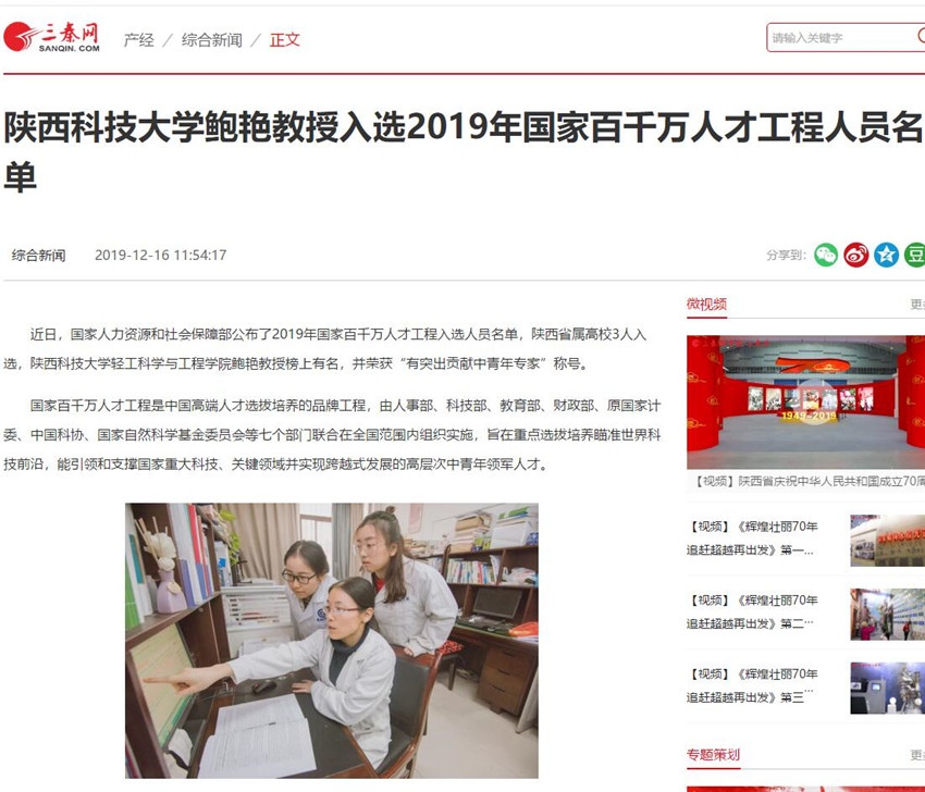 三秦網(wǎng):陜西科技大學鮑艷教授入選2019年國家百千萬人才工程人員名單