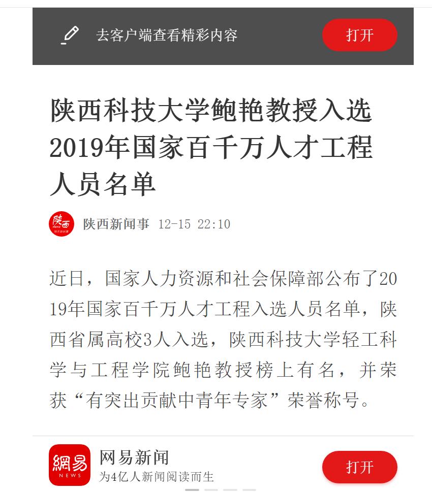網(wǎng)易新聞:陜西科技大學鮑艷教授入選2019年國家百千萬人才工程人員名單