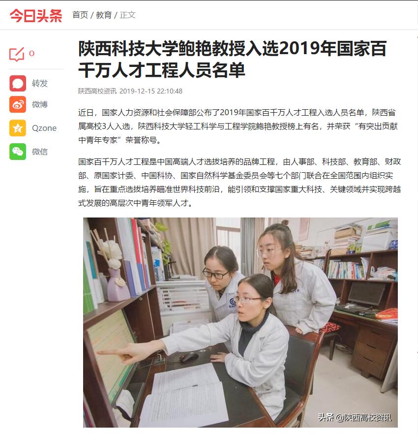 今日頭條:陜西科技大學鮑艷教授入選2019年國家百千萬人才工程人員名單