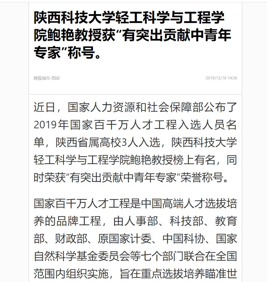 搜狐新聞:陜西科技大學輕工科學與工程學院鮑艷教授獲“有突出貢獻中青年專家”稱號