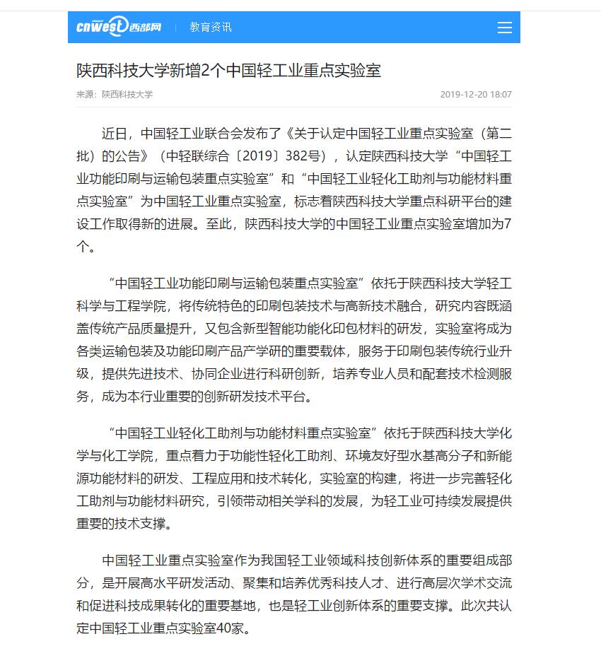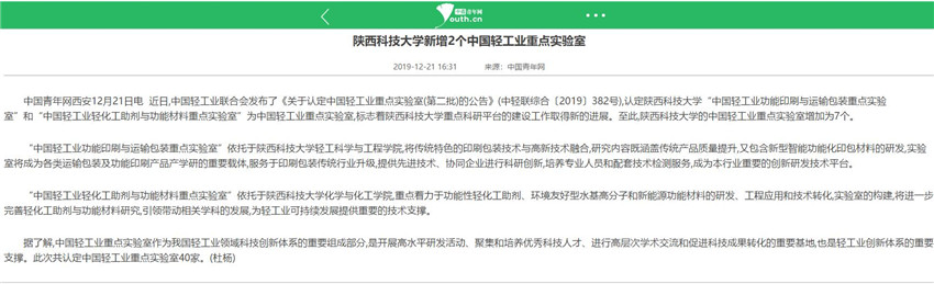 中國青年網(wǎng):陜西科技大學(xué)新增2個(gè)中國輕工業(yè)重點(diǎn)實(shí)驗(yàn)室