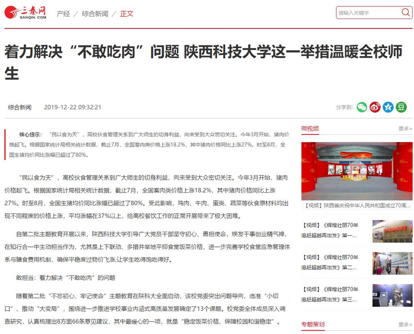 三秦網(wǎng):著力解決“不敢吃肉”問題 陜西科技大學(xué)這一舉措溫暖全校師生
