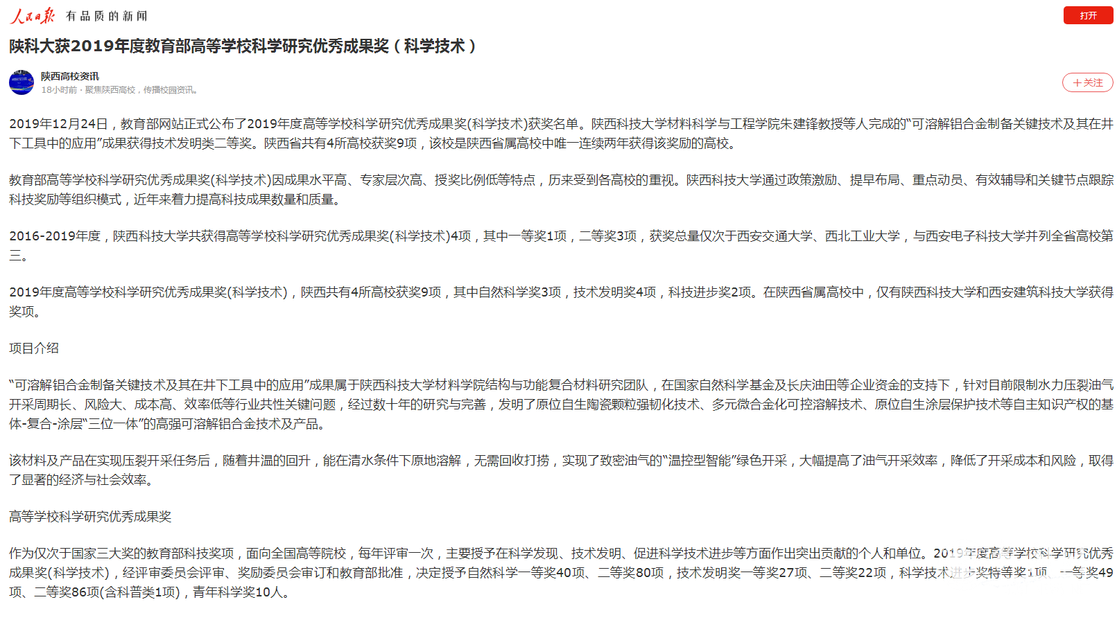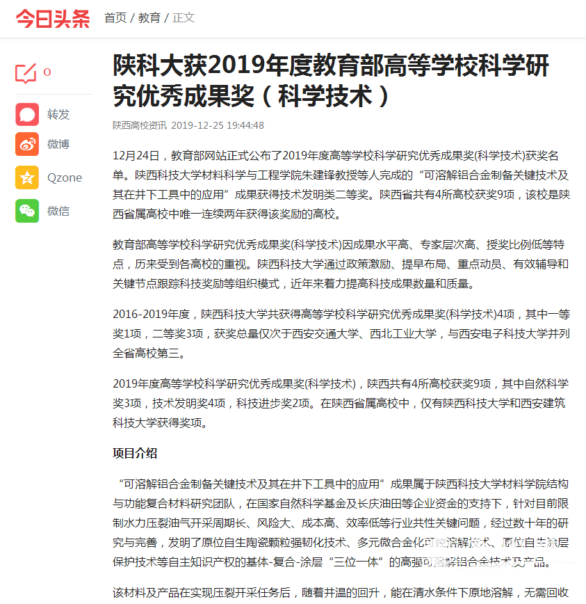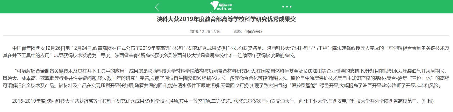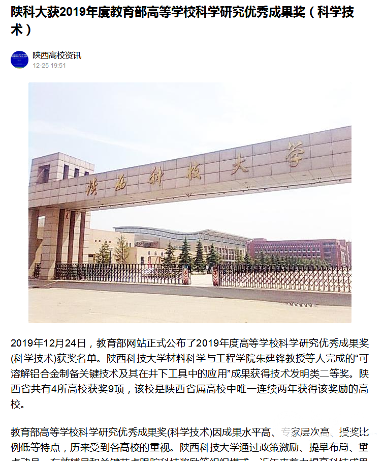 2019年12月24日,教育部網(wǎng)站正式公布了2019年度高等學(xué)??茖W(xué)研究優(yōu)秀成果獎(jiǎng)(科學(xué)技術(shù))獲獎(jiǎng)名單。陜西科技大學(xué)材料科學(xué)與工程學(xué)院朱建鋒教授等人完成的“可溶解鋁合金制備關(guān)鍵技術(shù)及其在井下工具中的應(yīng)用”成果獲得技術(shù)發(fā)明類二等獎(jiǎng)。陜西省共有4所高校獲獎(jiǎng)9項(xiàng),該校是陜西省屬高校中唯一連續(xù)兩年獲得該獎(jiǎng)勵(lì)的高校。