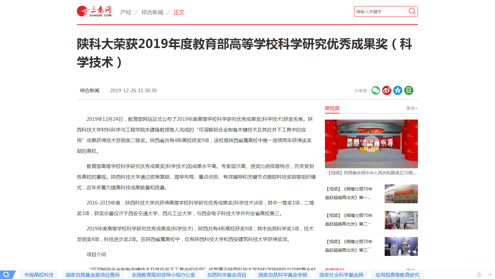 近日,三秦網(wǎng)、人民日報(bào)App、今日頭條、陜西高校資訊、中國青年網(wǎng)等媒體紛紛報(bào)道陜科大獲2019年度教育部高等學(xué)??茖W(xué)研究優(yōu)秀成果獎(jiǎng)(科學(xué)技術(shù))