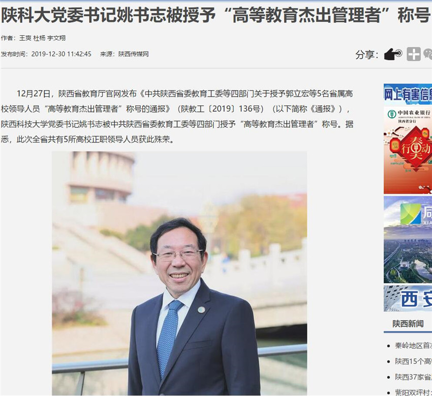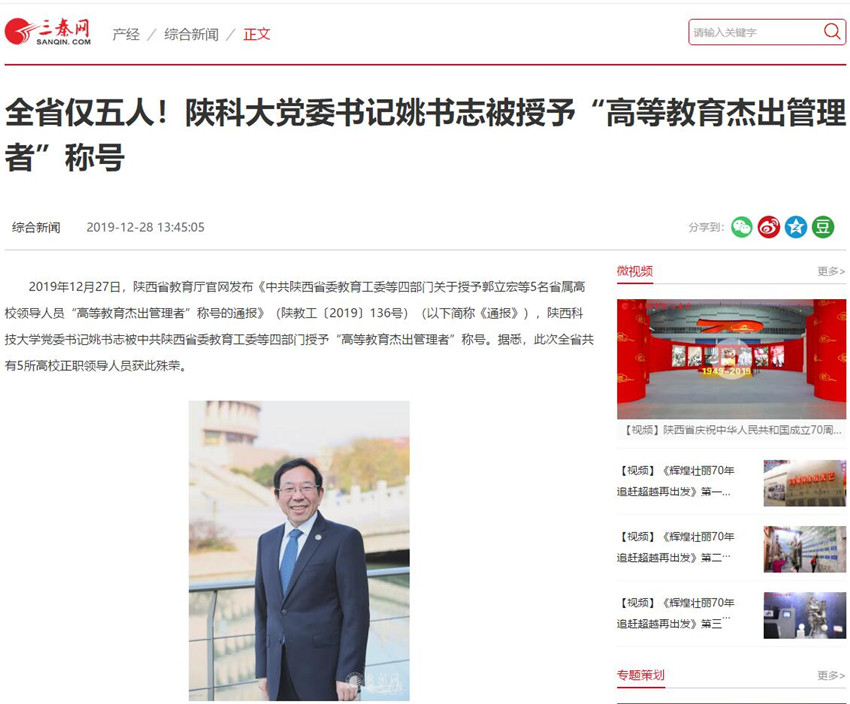 三秦網(wǎng):全省僅五人!陜科大黨委書(shū)記姚書(shū)志被授予“高等教育杰出管理者”稱(chēng)號(hào)