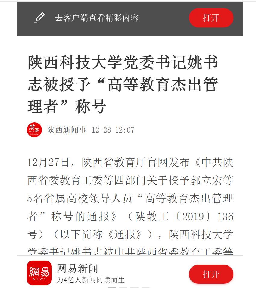 網(wǎng)易新聞APP:陜西科技大學(xué)黨委書(shū)記姚書(shū)志被授予“高等教育杰出管理者”稱(chēng)號(hào)
