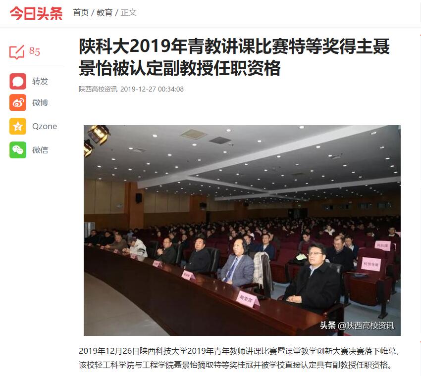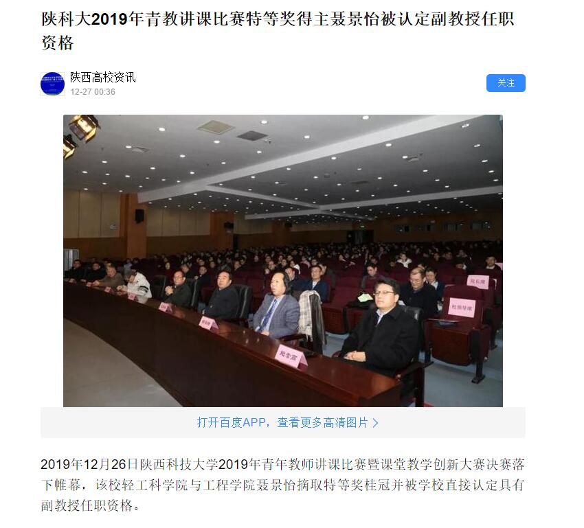 百度APP等媒體報(bào)道:陜科大2019年青教講課比賽特等獎(jiǎng)得主聶景怡被認(rèn)定副教授任職資格