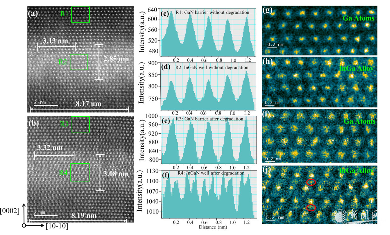 馬淑芳教授利用變溫微區(qū)光致發(fā)光譜儀(PL)和球差校正電子顯微鏡(ACTEM)分析了GaN基綠光LED老化后發(fā)光性能和有源區(qū)微觀結(jié)構(gòu)的變化。PL結(jié)果表明,老化后GaN基LED的發(fā)光強(qiáng)度下降36.8%且峰值波長(zhǎng)藍(lán)移1.6nm;STEM觀察進(jìn)一步發(fā)現(xiàn)了老化后InGaN量子阱中出現(xiàn)In間隙原子,InGaN量子阱的馳豫度達(dá)80%。結(jié)合HRXRD結(jié)果以及DFT計(jì)算,老化后GaN基綠光LED發(fā)光性能下降是由于點(diǎn)缺陷密度的增加、量子限制效應(yīng)減弱以及量子限制斯塔克效應(yīng)增強(qiáng)導(dǎo)致。本項(xiàng)工作利用ACTEM直接觀察到In間隙原子,揭示了點(diǎn)缺陷對(duì)GaN基綠光LED發(fā)光性能的影響機(jī)制。相關(guān)成果發(fā)表在國(guó)際知名期刊Appl. Phys. Lett.(IF= 3.597)(https://doi.org/10.1063/5.0021659)上。