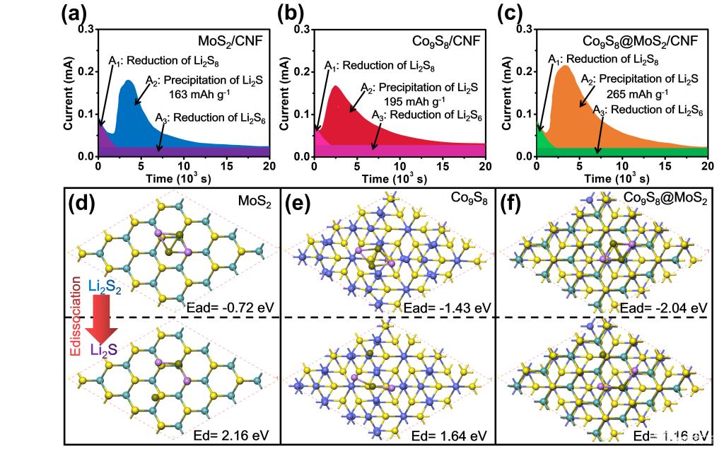 Li2S的成核實(shí)驗(yàn)結(jié)果及Li2S2在不同功能層結(jié)合能和解吸能的DFT計(jì)算結(jié)果