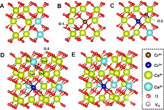 該研究是為了解決環(huán)境污染日益加劇的世界難題,開創(chuàng)新概念下的納米功能催化劑而開展的。二氧化鈰(CeO2)基三元催化劑被認(rèn)為是高效的去除汽車尾氣污染物的材料之一,而提升氧空位濃度一直是納米功能氧化物研究的一大切入點(diǎn)。CeO2得益于陽離子價(jià)態(tài)的靈活轉(zhuǎn)變而具備較高的氧空位濃度,具備較高的儲(chǔ)氧效率,因此被廣泛應(yīng)用于三元催化劑中。近些年來,研究者致力于提升CeO2中的氧空位濃度,主要措施包括:納米功能化、活性摻雜、晶面調(diào)控等。然而,研究中缺乏對CeO2材料的超微觀結(jié)構(gòu)表征及原子尺度下構(gòu)效關(guān)系深入的研究。本研究通過先進(jìn)的合成方法,制備出{100}晶面暴露的Cr摻雜CeO2納米晶,結(jié)合先進(jìn)的球差校正電子顯微鏡,深入研究了Cr摻雜元素對CeO2納米晶中的原子結(jié)構(gòu),如圖1所示。研究發(fā)現(xiàn),與未摻雜的CeO2納米晶相比,在Cr替位摻雜CeO2納米晶內(nèi)部Ce3+離子濃度得到明顯提高。其中,通過深入研究發(fā)現(xiàn),在較大尺寸的顆粒(>7 nm)內(nèi)部存在數(shù)量可觀的Ce3+離子,而未摻雜的CeO2納米晶內(nèi)部幾乎不存在還原的Ce離子,表明Cr摻雜元素引起晶粒內(nèi)部形成一定數(shù)量的Ce3+離子。同時(shí),通過第一性原理計(jì)算發(fā)現(xiàn),Cr元素能使得氧空位性能能從初始2.0 eV降低到0.99 eV,額外形成氧空位只需0.6 eV的能量;大幅降低了氧空位形成能,如圖2所示。與此同時(shí),氧原子在400oC下的遷移率達(dá)到5*10-10m2s-1,是未摻雜的CeO2納米晶中氧原子遷移能力的10倍。降低的氧空位形成能以及高的氧原子遷移能力共同使得Cr摻雜CeO2納米晶表現(xiàn)出十分優(yōu)異的OSC性能。本研究加深了對摻雜CeO2納米材料的缺陷形成和作用機(jī)制的理解,為設(shè)計(jì)和制備基于活性摻雜、晶面調(diào)控、納米尺寸化等功能化因素的新型的CeO2基催化劑提供可靠的理論依據(jù)和實(shí)驗(yàn)數(shù)據(jù)。