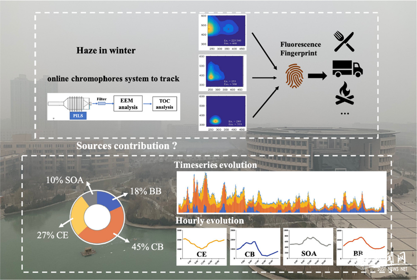 該課題研究歷時三年,得到了國家自然科學基金項目(41703102、41877354),陜西科技大學“青年拔尖”啟動經(jīng)費等資金支持。主要分為兩方面的工作:一是技術方面,開發(fā)了基于熒光指紋示蹤的大氣PM2.5化學組分分析、大氣化學反應機制探討、大氣污染來源鑒定的技術方法;二是設備方面,實現(xiàn)了大氣PM2.5在線捕獲系統(tǒng)(PILS)與三維熒光光譜(EEM)、總有機碳分析儀(TOC)的串聯(lián)并用。綜合以上兩方面的技術和硬件平臺,最終實現(xiàn)了大氣污染物在線監(jiān)測和來源解析的功能,獲得數(shù)據(jù)可應用于精確了解大氣污染物的起源、揭示污染產(chǎn)生和消失機制,最終服務區(qū)域大氣污染的治理。團隊以陜科大大氣監(jiān)測站點為中心,利用該監(jiān)測設備已相繼開展了“冬季霧霾形成過程與成因解析”“春季沙塵暴發(fā)生觀測與空氣質量影響分析”“夏季大氣污染物化學反應機制”等具體研究。