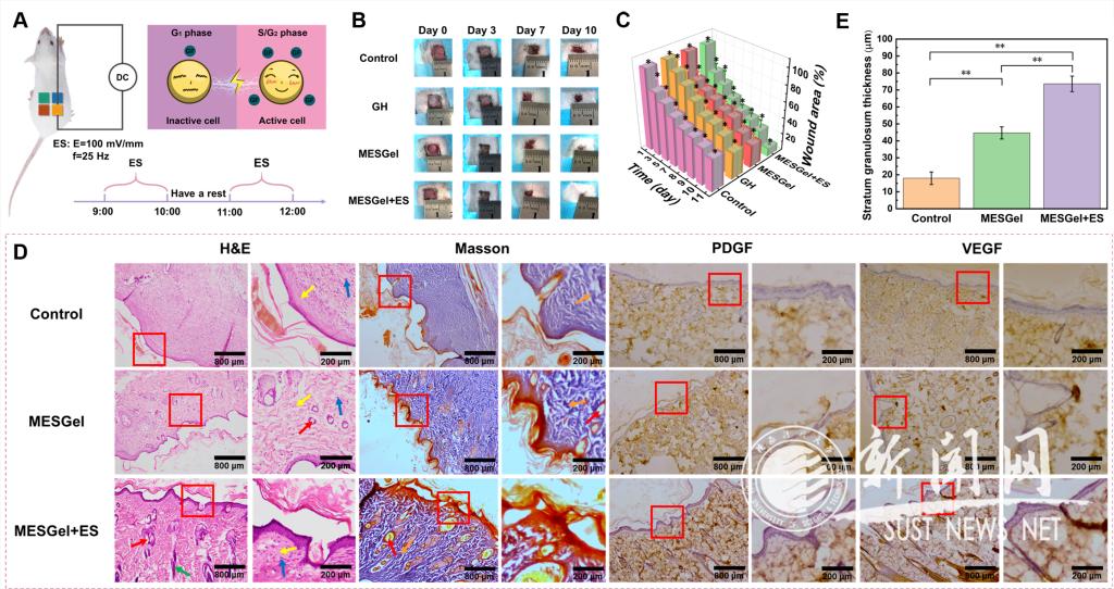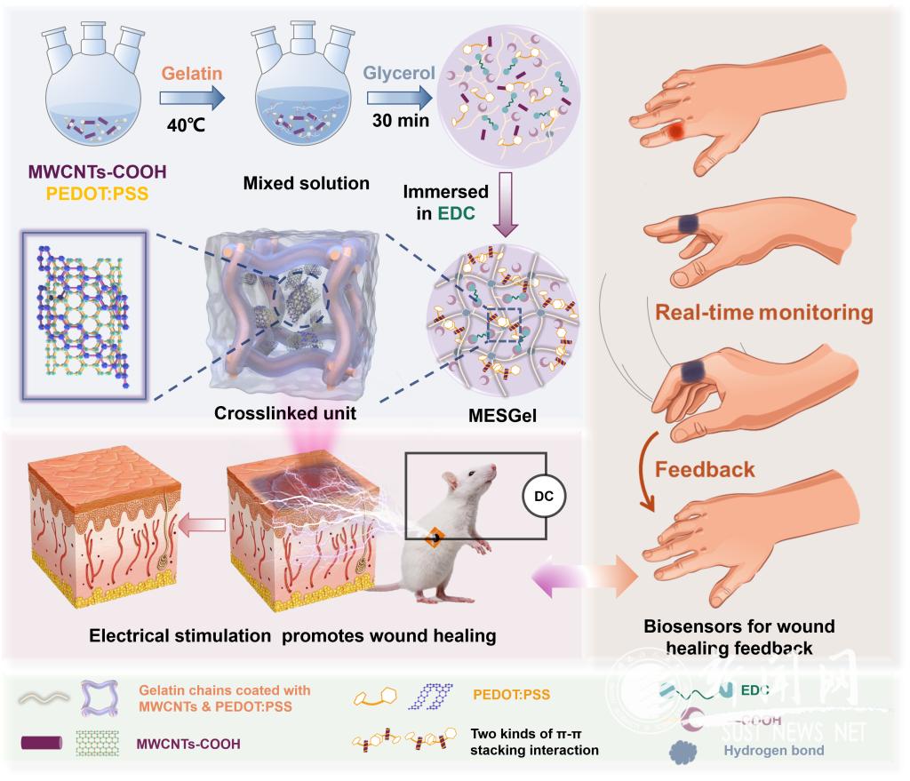 該論文以明膠為原料構(gòu)建了多功能仿生電子柔性醫(yī)用電子皮膚。目前,組織化工程支架存在促組織誘導(dǎo)再生能力相對(duì)不足、功能單一、與細(xì)胞相互作用較差等問(wèn)題,本研究結(jié)合其智能化、功能化的發(fā)展趨勢(shì)與電刺激促細(xì)胞生長(zhǎng)的基本理念,設(shè)計(jì)構(gòu)建了一種具有一定機(jī)械強(qiáng)度、電活性和自修復(fù)性能的水凝膠支架(MESGel),可用于電刺激加速傷口愈合和運(yùn)動(dòng)傳感。MESGel具有優(yōu)異的生物相容性和多功能特性,包括柔韌性、自愈合性能、生物降解性和生物電活性。綜合生物實(shí)驗(yàn)證明,MESGel電子皮膚支架能通過(guò)電刺激作用,積極促進(jìn)倉(cāng)鼠肺上皮細(xì)胞的增殖,從而誘導(dǎo)皮膚創(chuàng)傷愈合,為全層皮膚缺損模型提供了一種有效的治療策略。此外,MESGel還可作為一種新型柔性電子皮膚傳感器實(shí)時(shí)記錄傷口愈合過(guò)程的運(yùn)動(dòng)信號(hào),有望實(shí)現(xiàn)傷口治療-實(shí)時(shí)監(jiān)測(cè)一體化。該研究對(duì)生物質(zhì)膠原高值資源化及多功能醫(yī)用支架構(gòu)建提供了新的思路,具有一定的科學(xué)研究意義和應(yīng)用推廣價(jià)值。