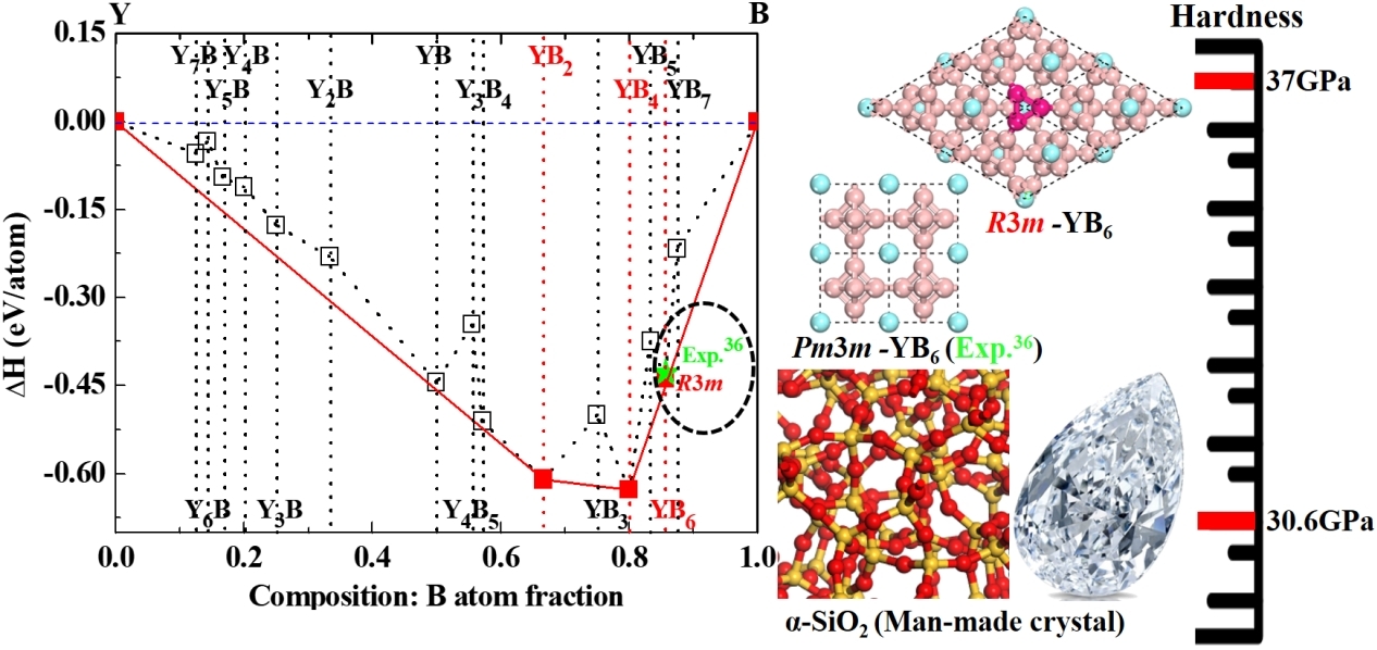 成果3:硼化釔因其超導(dǎo)性和高化學(xué)穩(wěn)定性而備受關(guān)注。然而,硼化釔的機(jī)械性能和硬度的相關(guān)知識(shí)還不清楚?;贑ALYPSO全局結(jié)構(gòu)搜索技術(shù)和第一性原理,對(duì)不同化學(xué)配比的硼化釔進(jìn)行了系統(tǒng)研究。結(jié)果預(yù)測(cè)了一種具有R3m六方結(jié)構(gòu)的新型硼釔化合物YB6,與實(shí)驗(yàn)合成的Pm3?m結(jié)構(gòu)相比,預(yù)測(cè)的R3m-YB6更穩(wěn)定。計(jì)算的生成焓、彈性常數(shù)和聲子譜清晰的表明,R3m-YB6具有較高的機(jī)械穩(wěn)定性和動(dòng)力學(xué)穩(wěn)定性。電子態(tài)密度和能帶結(jié)構(gòu)顯示,所有穩(wěn)定的硼酸釔都具有金屬性?;谖覀冮_(kāi)發(fā)的半經(jīng)驗(yàn)硬度公式,計(jì)算R3m-YB6的維氏硬度為37.0 GPa,表明它是一種潛在的超硬金屬。該研究為實(shí)驗(yàn)合成超硬硼化釔晶體提供理論依據(jù)。該研究成果發(fā)表于自然指數(shù)期刊“Journal of Physical Chemistry Letter 12, 5423-5429 ”。丁利蘋(píng)副教授為第一作者,邵鵬副教授為共同通訊作者。