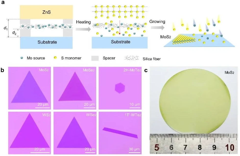 成果2:丁利蘋(píng)副教授與北京大學(xué)王恩哥院士、劉開(kāi)輝教授,南方科技大學(xué)俞大鵬院士、韓國(guó)基礎(chǔ)科學(xué)研究院丁峰教授等合作,針對(duì)目前常規(guī)方法中采用升華硫單質(zhì)制備二維半導(dǎo)體TMDs中存在高密度硫空位的問(wèn)題,提出了一種表界面硫族單原子供應(yīng)制備高品質(zhì)TMDs及其合金的新方法。該方法通過(guò)設(shè)計(jì)局域空間,成功實(shí)現(xiàn)低缺陷密度、優(yōu)異光學(xué)和電學(xué)特性的單層MX2(M=Mo、W;X=S、Se、Te)晶圓制備,并首次報(bào)道了四元合金MoS2(1-x-y)Se2xTe2y的可控合成。該成果被推薦為“中國(guó)半導(dǎo)體十大研究進(jìn)展候選”(新聞鏈接https://mp.weixin.qq.com/s/RI5UCUCUgQSigi2vkGW3nQ)。相關(guān)研究成果發(fā)表于“Nature Communications 13, 1007”雜志上。左勇剛、劉燦、丁利蘋(píng)、喬瑞喜為論文共同第一作者;北京大學(xué)劉開(kāi)輝、韓國(guó)基礎(chǔ)科學(xué)研究院丁峰、中國(guó)科學(xué)院物理研究所白雪冬和北京大學(xué)博士后劉燦為共同通訊作者。