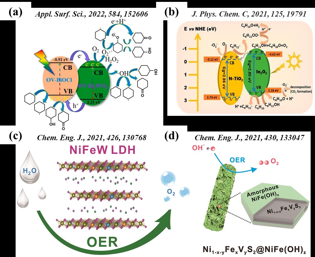 圖2 環(huán)己烷氧化體系開(kāi)發(fā):(a)Bi2WO6/BiOCl光催化環(huán)己烷氧化制KA油;(b)In2O3/N-TiO2光催化環(huán)己烷氧化高選擇性制環(huán)己酮。電解水體系開(kāi)發(fā):(c)NiFeW LDH作為OER反應(yīng)的高效電催化劑;(d)核殼Ni1-x-yFexVyS2@NiFe(OH)z作為OER反應(yīng)的高效電催化劑