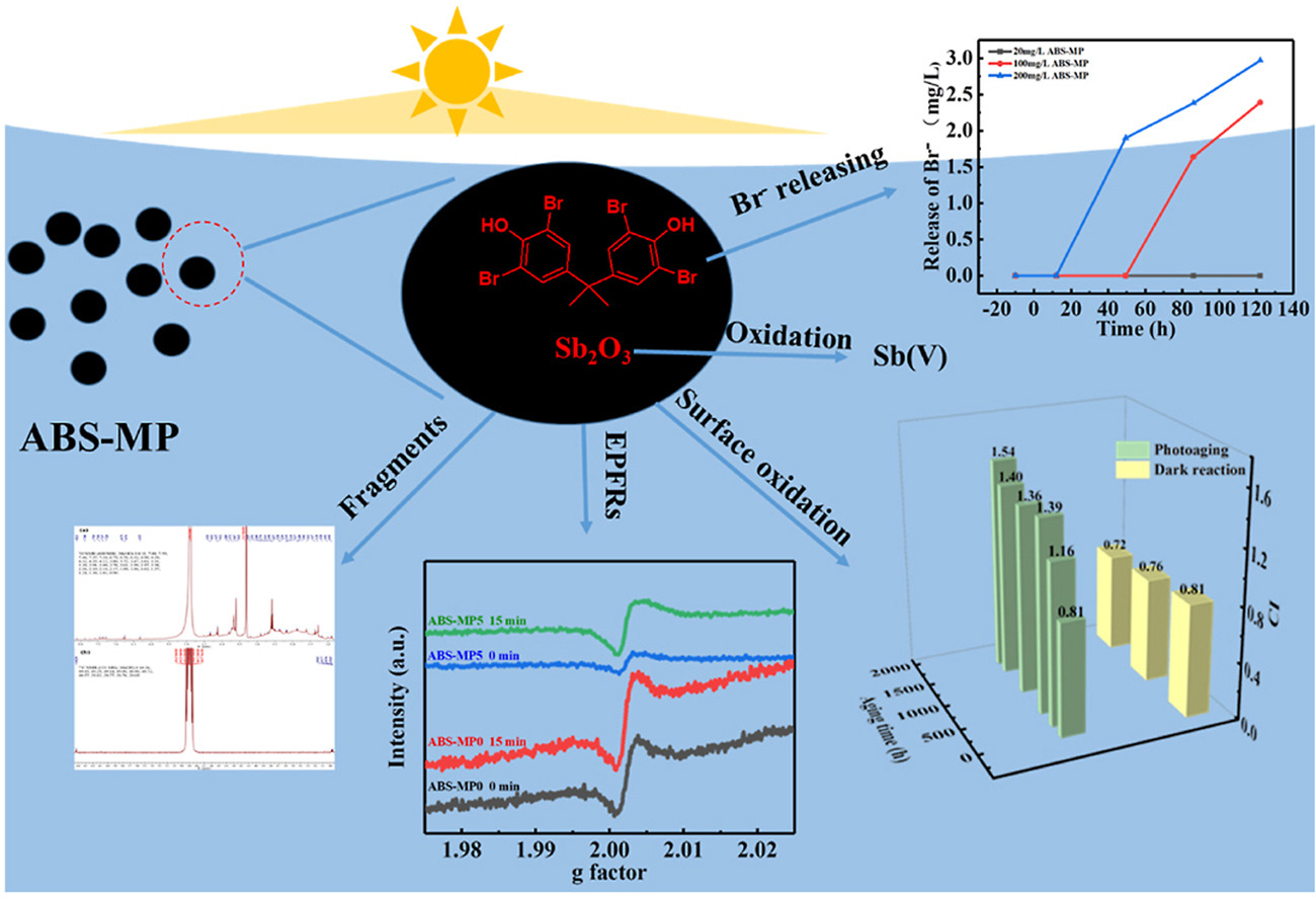 微塑料(MPs)污染已成為一個重要的環(huán)境問題,并對多種生物構(gòu)成威脅。胡學(xué)鋒教授研究了水中丙烯腈-丁二烯-苯乙烯微塑料(ABS-MP)在模擬太陽光照射下進(jìn)行光老化產(chǎn)生的表面形貌和官能團(tuán)的變化,同時檢測老化產(chǎn)物在水中的釋放。調(diào)研了老化程度對環(huán)境持久性自由基(EPFRs)的影響及光照下二次EPFRs的生成??疾炝颂砑觿┧匿咫p酚A(TBBPA)和Sb2O3在光老化過程中的轉(zhuǎn)化。論文發(fā)表在環(huán)境TOP期刊Journal of Environmental Management。ABS及其添加劑TBBPA在自然環(huán)境中光老化及轉(zhuǎn)化的研究,有助于對進(jìn)入環(huán)境中微塑料潛在危害的深入理解。