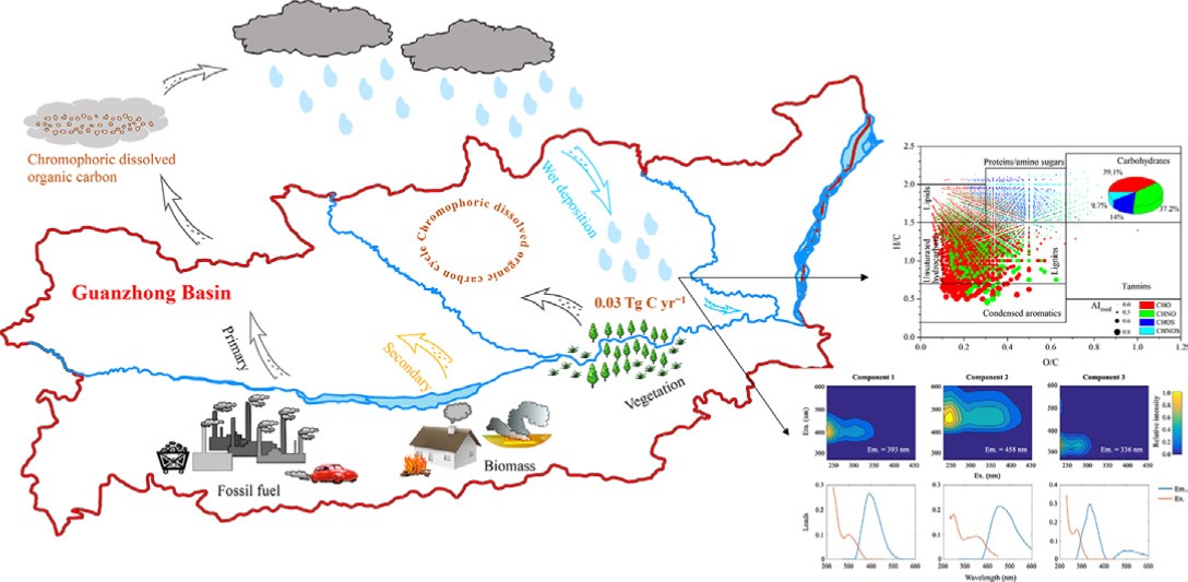 李小飛副教授在環(huán)境領域TOP期刊Science of the Total Environment發(fā)表了題為Chromophoric dissolved organic carbon cycle and its molecular compositions and optical properties in precipitation in the Guanzhong basin, China的研究文章。利用激發(fā)發(fā)射矩陣熒光光譜、傅里葉變換離子共振質(zhì)譜以及源解析模型研究了關中盆地大氣降水中水溶性有機碳(WSOC)的光學特征、分子特性和來源。李小飛指出西安市WSOC中有兩種腐殖質(zhì)樣物質(zhì)(HULIS)和一種蛋白樣物質(zhì)(PRLIS)共三種熒光組分,且總熒光強度的79%由HULIS提供。木質(zhì)素、蛋白質(zhì)/氨基糖和脂質(zhì)是主要化合物。二次前體物、煤燃燒和二次氣溶膠是西安WSOC的主要來源。此外,估算發(fā)現(xiàn)西安大氣降水中WSOC的濕沉積量約為0.63 g C·m?2yr?1。這些研究成果增加了我們對吸光性有機碳估算的理解。