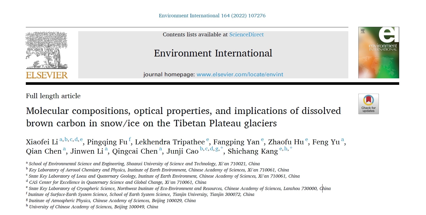Xiaofei Li, Pingqing Fu, Lekhendra Tripathee, Fangping Yan, Zhaofu Hu, Feng Yu, Qian Chen, Jinwen Li, Qingcai Chen, Junji Cao?, Shichang Kang. Molecular compositions, optical properties, and implications of dissolved brown carbon in snow/ice on the Tibetan Plateau glaciers.Environment International, 2022,164, 107276.