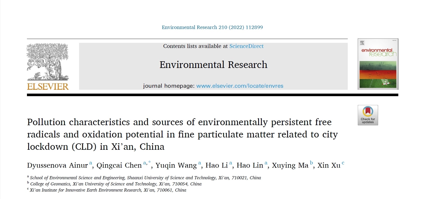Dyussenova Ainur, Qingcai Chen?, Yuqin Wang, Hao Li, Hao Lin, Xuying Ma, Xin Xu.Pollution characteristics and sources of environmentally persistent free radicals and oxidation potential in fine particulate matter related to city lockdown (CLD) in Xi'an, China.Environmental Research, 2022, 210, 112899.
