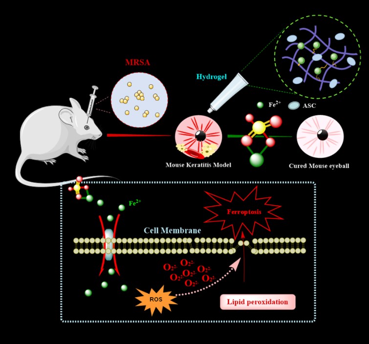 研究簡介:使用抗生素是當(dāng)下治療細(xì)菌性角膜炎的主要手段。然而,頻繁出現(xiàn)的耐藥菌,特別是耐甲氧西林金黃色葡萄球菌(MRSA)等“超級細(xì)菌”,對目前依賴抗生素的治療體系提出嚴(yán)峻挑戰(zhàn),亟需研發(fā)新型抗菌策略。受哺乳動物鐵死亡啟發(fā),本研究探索并采用了直接鐵暴露的方式誘導(dǎo)細(xì)菌發(fā)生鐵死亡。結(jié)果發(fā)現(xiàn)被經(jīng)常作為食品級補(bǔ)鐵劑的硫酸亞鐵能夠高效殺死金黃色葡萄菌,并引發(fā)其產(chǎn)生鐵死亡的典型特征。此外,硫酸亞鐵還能有效地殺死存留細(xì)胞(persister)和超級耐藥菌MRSA,并清除金黃色葡萄球菌的生物被膜。為了促進(jìn)硫酸亞鐵在醫(yī)療領(lǐng)域中的應(yīng)用,本研究利用透明質(zhì)酸和抗壞血酸鹽制備了負(fù)載硫酸亞鐵的水凝膠。該水凝膠具有可注射、自愈合、高效殺滅MRSA,以及很好的生物相容性等特點。進(jìn)一步通過構(gòu)建由MRSA感染導(dǎo)致的小鼠角膜炎模型,我們發(fā)現(xiàn)該硫酸亞鐵水凝膠能夠促進(jìn)小鼠角膜炎的快速恢復(fù),并有效防止MRSA向肺部的擴(kuò)散以及緩解小鼠的全身炎癥。這些結(jié)果揭示了硫酸亞鐵水凝膠替代抗生素依賴性材料來治療MRSA感染的應(yīng)用前景,為當(dāng)前抗生素危機(jī)下人類角膜炎的臨床治療提供了新的策略。相關(guān)產(chǎn)品已經(jīng)申報了國家發(fā)明專利。