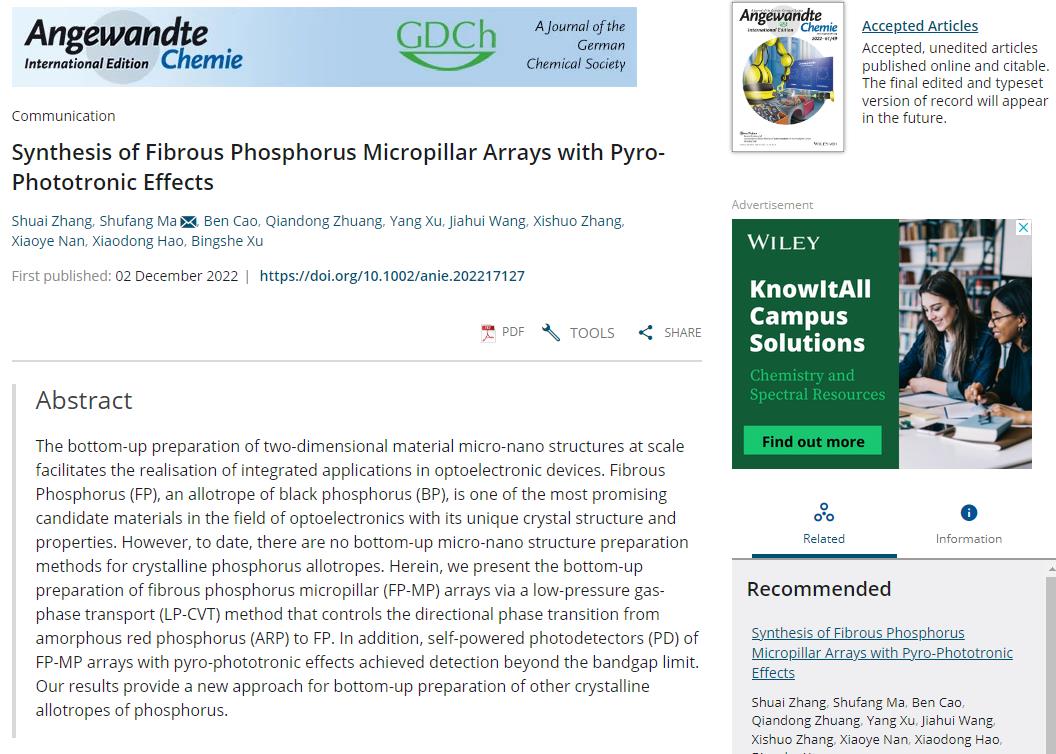 Synthesis of Fibrous Phosphorus Micropillar Arrays with Pyro-Phototronic Effects. Shuai Zhang, Shufang Ma, Ben Cao, Qiandong Zhuang, Yang Xu, Jiahui Wang, Xishuo Zhang, Xiaoye Nan, Xiaodong Hao, and Bingshe Xu.Angewandte Chemie International EditionDOI:10.1002/anie.202217127.