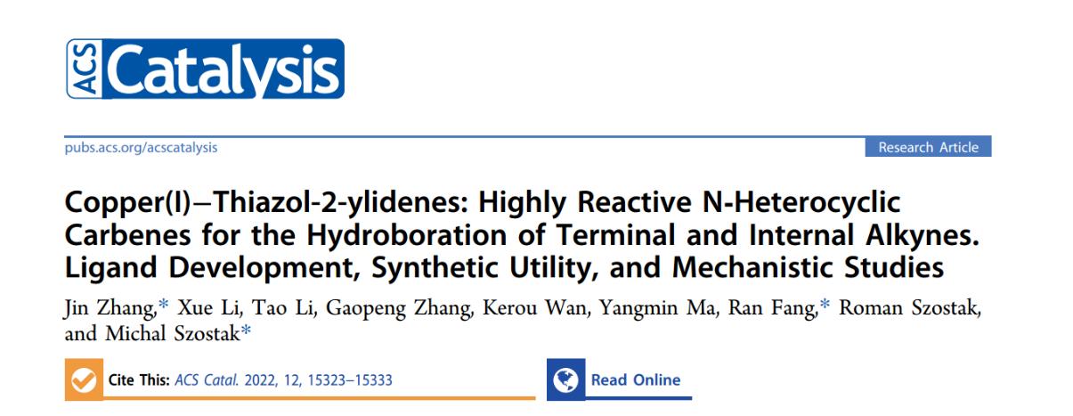 Zhang Jin*; Li Xue; Li Tao; Zhang Gaopeng; Wan Kerou; Ma Yangmin; Fang Ran*; Szostak Roman; Szostak Michal*,Copper(I)–Thiazol-2-ylidenes: Highly Reactive N-Heterocyclic Carbenes for Hydroboration of Terminaland Internal Alkynes. Ligand Development, Synthetic Utility and Mechanistic Studies,ACS Catalysis,2022, 12, 15323-15333.
