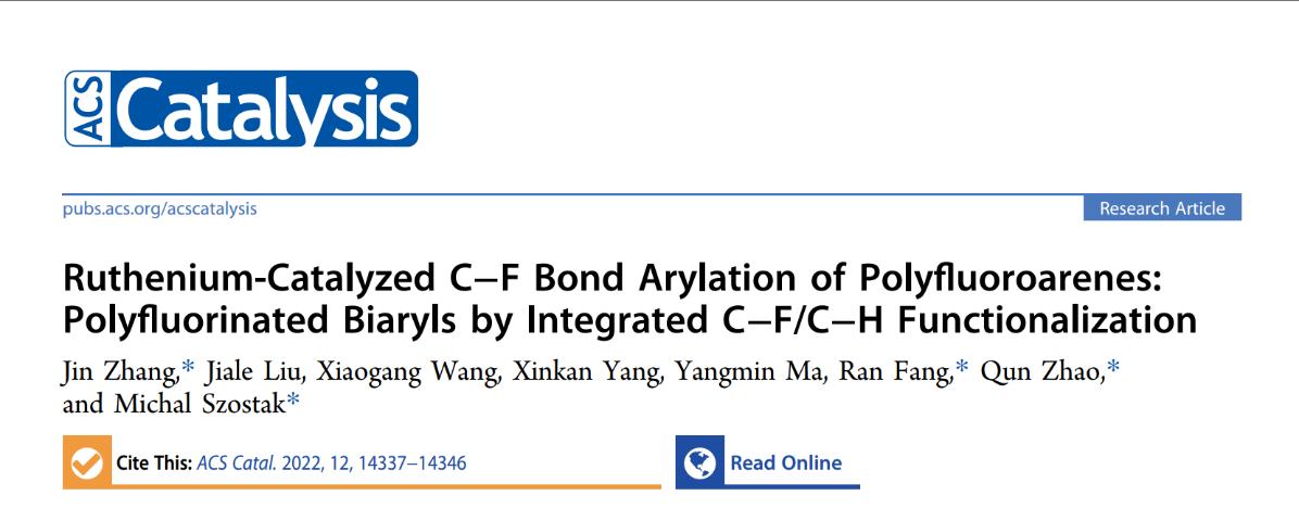 Zhang Jin*; Liu Jiale; Wang Xiaogang; Yang Xinkan; Ma Yangmin; Fang Ran*; Zhao Qun*; Szostak Michal*,Ruthenium-Catalyzed C–F Bond Arylation of Polyfluoroarenes: Polyfluorinated Biaryls by Integrated C–F/C–H Functionalization,ACS Catalysis,2022, 12(22), 14337-14346.