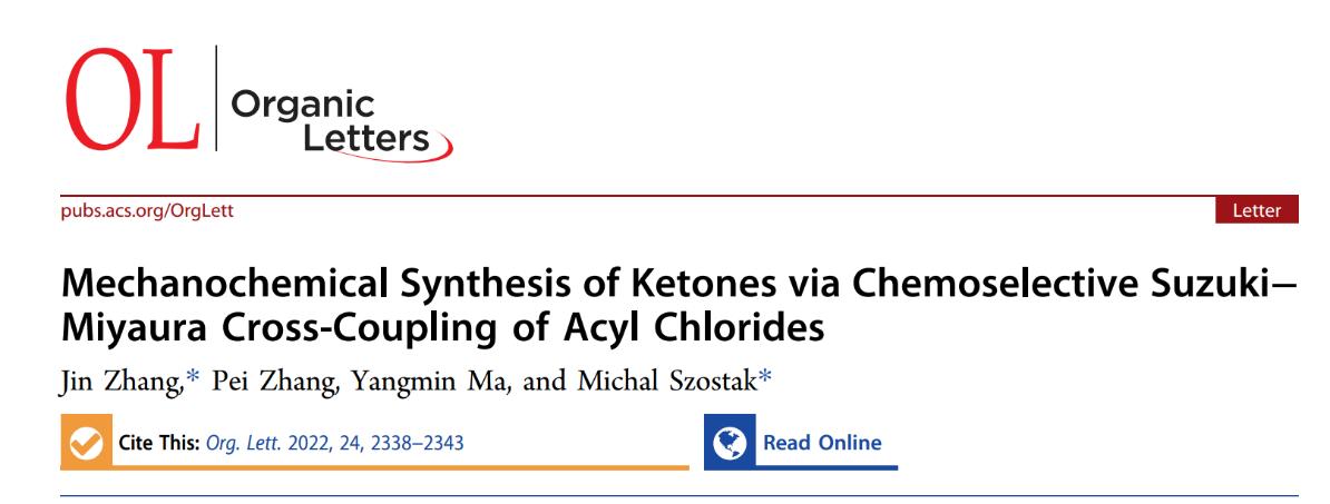Zhang Jin*, Zhang Pei, Ma Yangmin, Szostak Michal*, Mechanochemical Synthesis of Ketones via Chemoselective Suzuki-Miyaura Cross-Coupling of Acyl Chlorides,Organic Letters,2022, 24(12), 2338-2343.