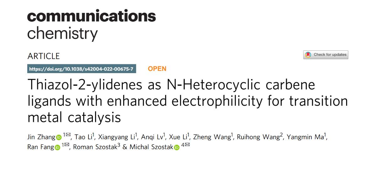 Zhang Jin*; Li Tao; Li Xiangyang; Lv Anqi; Li Xue; Wang Zheng; Wang Ruihong; Ma Yangmin; Fang Ran*; Szostak Roman; Szostak Michal*,Thiazol-2-ylidenes as N-Heterocyclic Carbene Ligands with Enhanced Electrophilicity for Transition Metal Catalysis,Communications Chemistry,2022,5(1),60.