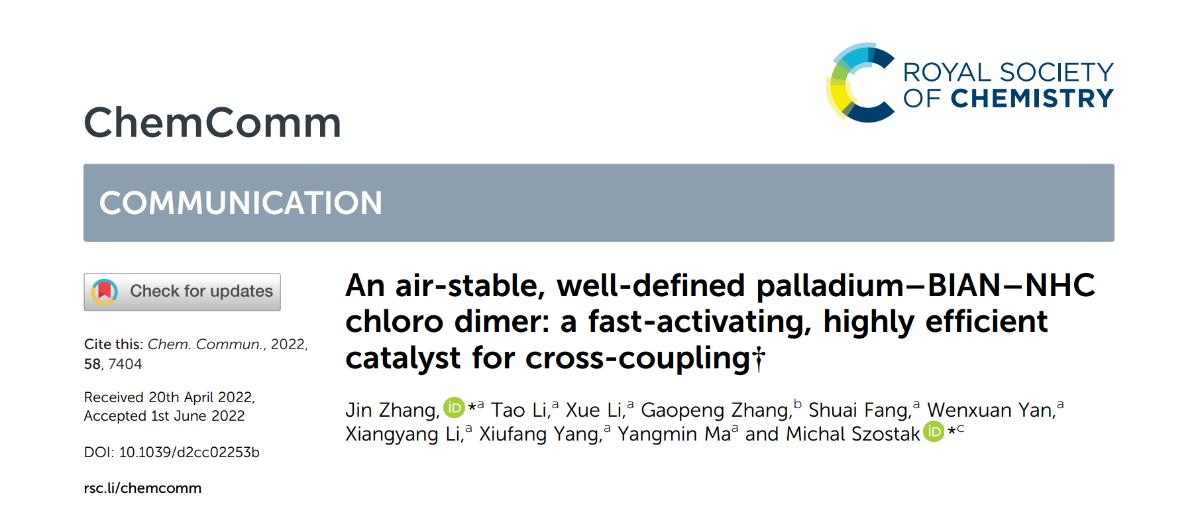 Zhang Jin*; Li Tao; Li Xue; Zhang Gaopeng; Fang Shuai; Yan Wenxuan; Li Xiangyang; Yang Xiufang; Ma Yangmin; Szostak Michal*,AnAir-Stable, Well-Defined Palladium–BIAN–NHC Chloro Dimer: Fast-Activating, Highly Efficient Catalyst for Cross-Coupling,Chemical Communications,2022, 58(53), 7404-7407.