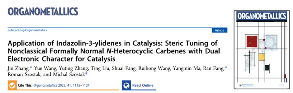 Zhang Jin*; Wang Yue; Zhang Yuting; Liu Ting; Fang Shuai; Wang Ruihong; Ma Yangmin; Fang Ran*; Szostak Roman;Szostak Michal*,Application of Indazolin-3-ylidenes in Catalysis: Steric Tuning of Nonclassical Formally Normal N-Heterocyclic Carbenes with Dual Electronic Character for Catalysis,Organometallics,2022,41(9),1115-1124.
