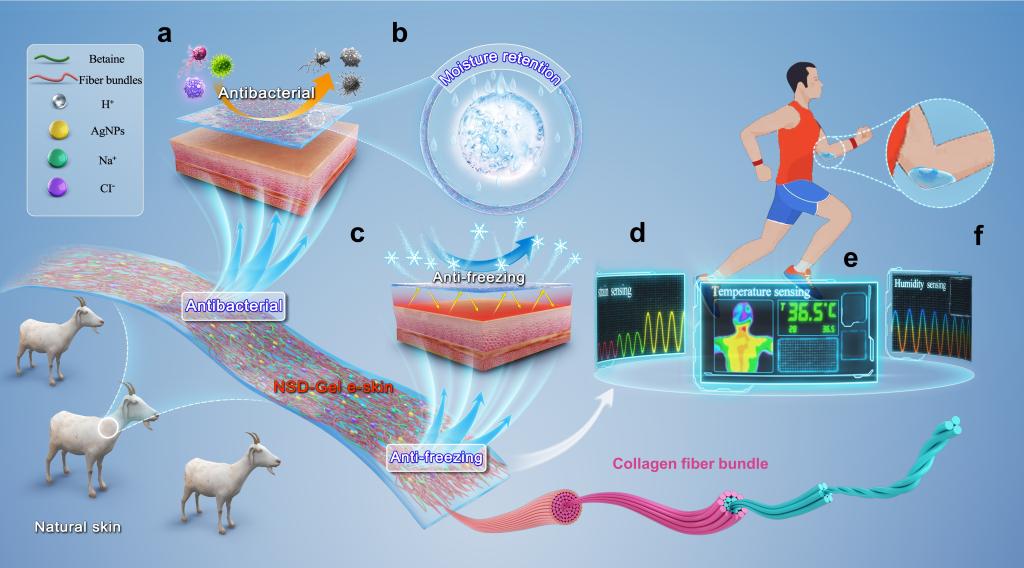 電子皮膚(e-skins)在機(jī)械性能上與人體皮膚類(lèi)似,被認(rèn)為是用于無(wú)創(chuàng)人機(jī)交互和可穿戴設(shè)備的理想電子裝置。為了完全模仿人類(lèi)皮膚,電子皮膚應(yīng)該擁有可靠的機(jī)械性能;同時(shí)能夠抵抗外部環(huán)境變化,如熱、冷、干燥和細(xì)菌;并且能夠感知多種外部刺激,如溫度、濕度和應(yīng)變。研究采用簡(jiǎn)單的一鍋法,以天然皮膚為基材,并引入甜菜堿、銀納米粒子(AgNPs)、氯化鈉(NaCl)和甘油/水二元溶劑形成的混合液,以納米化方式設(shè)計(jì)了一種全新的多功能天然皮膚基有機(jī)水凝膠電子皮膚(NSD-Gel e-skin)。NSD-Gel e-skin顯示出良好的透明度以及優(yōu)異的拉伸強(qiáng)度(7.33 MPa)、抗穿刺性、保濕性、回濕性和抗菌性。此外,NSD-Gel e-skin具有優(yōu)異的耐寒/耐熱性和刺激反應(yīng)特性,可以有效地感知環(huán)境溫度或濕度的變化,以及監(jiān)測(cè)人體生理/運(yùn)動(dòng)信號(hào)。體外和體內(nèi)實(shí)驗(yàn)表明,NSD-Gel e-skin具有理想的生物相容性,即使在惡劣的環(huán)境中(-196℃至100℃)也能起到組織保護(hù)作用。NSD-Gel e-skin在可穿戴電子設(shè)備、人機(jī)界面和人工智能等領(lǐng)域具有巨大的應(yīng)用潛力,為開(kāi)發(fā)具有按需特性的高性能電子皮膚提供了一個(gè)重要平臺(tái)。
