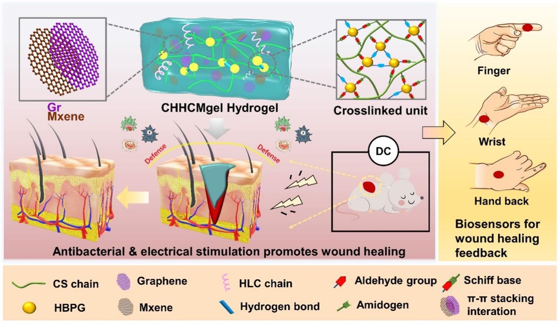 具有新興生物電子學(xué)的導(dǎo)電水凝膠在整合實(shí)時(shí)監(jiān)測(cè)電刺激下的損傷運(yùn)動(dòng)和治療效果以及多功能治療性方面顯示出巨大潛力。受天然皮膚的啟發(fā),本文設(shè)計(jì)了一種具有機(jī)械柔性、抗菌、電活性、生物粘合等功能的超支化聚合物基多功能電子水凝膠(CHHCMgel)。CHHCMgel具有所有理想的多功能特性,包括可調(diào)節(jié)的機(jī)械和生物電活性特性、快速凝膠化時(shí)間、自愈合能力和可重復(fù)粘附性。此外,CHHCMgel具有優(yōu)越的生物相容性和抗菌活性。體內(nèi)、外實(shí)驗(yàn)表明,CHHCMgel可以實(shí)時(shí)監(jiān)測(cè)人體運(yùn)動(dòng),同時(shí)在特定電刺激下對(duì)止血效果、細(xì)胞增殖和進(jìn)一步的皮膚傷口愈合具有顯著的綜合治療效果,證實(shí)所提出的CHHCMgel支架可用于全層皮膚傷口愈合,作為新型柔性“傷口治療-健康監(jiān)測(cè)”生物電子植入物具有巨大潛力。