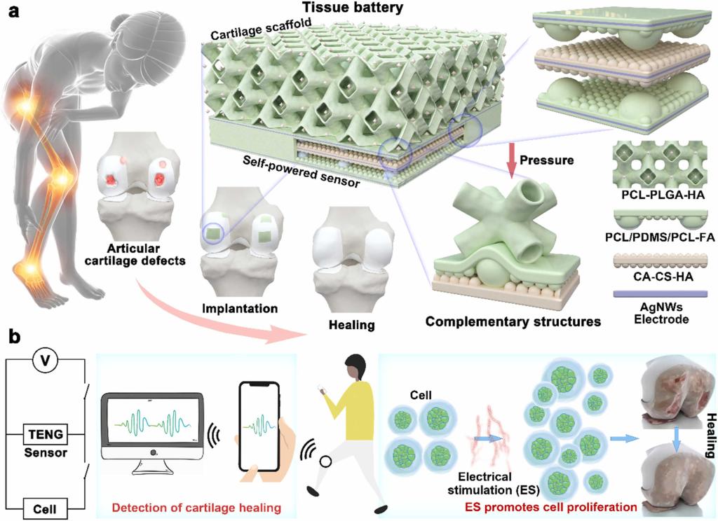 目前,軟骨缺損治療如軟骨移植、關(guān)節(jié)內(nèi)注射治療、軟骨組織工程技術(shù)需要較長(zhǎng)的修復(fù)期,且存在的“黑箱”狀態(tài)阻礙軟骨狀態(tài)的實(shí)時(shí)檢測(cè)。本研究制備的智能“組織電池”由自發(fā)電納米發(fā)電機(jī)(TENG)和軟骨支架兩部分組成。該軟骨“組織電池”兼具自供電、高靈敏度、可植入、抗干擾等特點(diǎn)。基于接觸分離機(jī)制的TENG在常見(jiàn)關(guān)節(jié)運(yùn)動(dòng)壓力范圍內(nèi)(0?1.8 MPa)具有較高的靈敏度(52.5 V MPa?1),使“組織電池”能夠在“黑箱”中原位檢測(cè)軟骨修復(fù)的實(shí)時(shí)狀態(tài)。此外,體外和體內(nèi)綜合實(shí)驗(yàn)表明,“組織電池”將關(guān)節(jié)運(yùn)動(dòng)產(chǎn)生的機(jī)械能轉(zhuǎn)化為電能,通過(guò)電刺激的手段加速支架內(nèi)的軟骨細(xì)胞增殖,從而縮短軟骨修復(fù)周期。另外,該“組織電池”具有優(yōu)良的生物相容性和可調(diào)控的生物降解性,在軟骨修復(fù)過(guò)程中表現(xiàn)出優(yōu)異的耐用性和穩(wěn)定性,且在修復(fù)結(jié)束后一段時(shí)間內(nèi)可完全降解并被人體代謝。該“誘導(dǎo)組織再生—修復(fù)實(shí)時(shí)監(jiān)測(cè)”一體化“組織電池”可用于醫(yī)療康復(fù)領(lǐng)域,有利于減輕軟骨缺損患者的疼痛和治療費(fèi)用,可作為新型的生物電子植入材料。