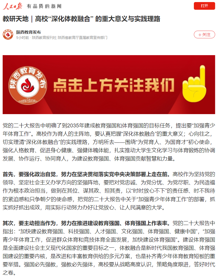 《人民日報》APP:高校“深化體教融合” 的重大意義與實踐理路
