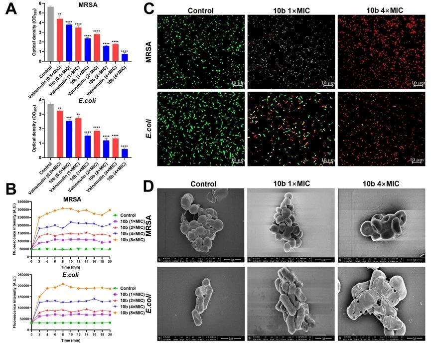 通過(guò)激光共聚焦顯微鏡以及場(chǎng)發(fā)射掃描電鏡等手段探究10b的抗菌機(jī)制。結(jié)果顯示,在已上市的截短側(cè)耳素類抗生素共同作用機(jī)制基礎(chǔ)上,10b還能夠通過(guò)破壞耐藥革蘭氏陰性菌的生物膜與細(xì)菌細(xì)胞膜來(lái)發(fā)揮抗菌作用。