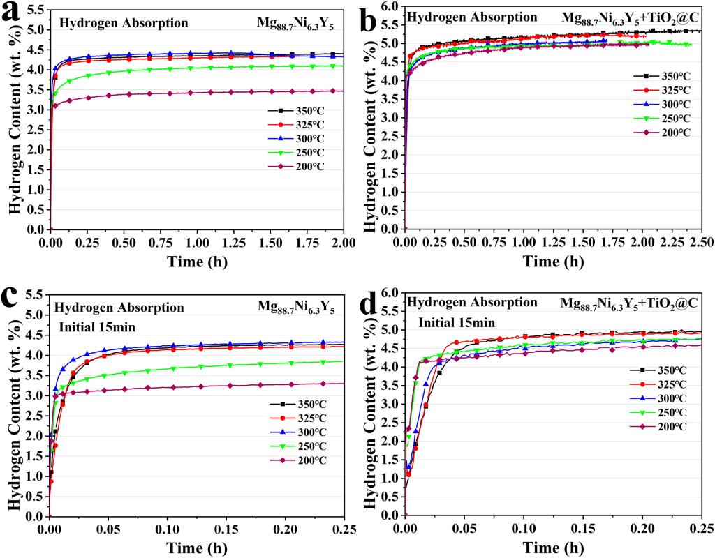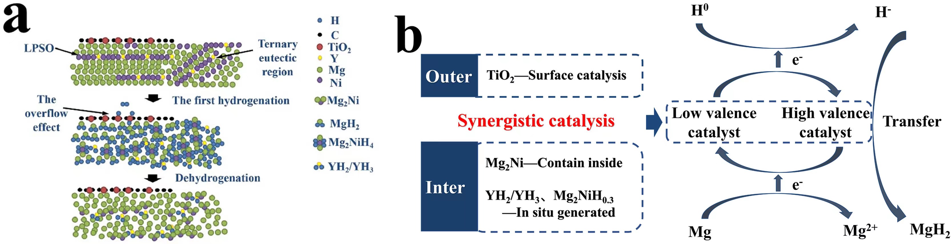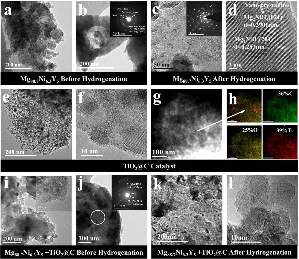 宋文杰團隊通過合金成分設計,制備了一種含有14H型LPSO(長周期堆積有序)結構和三元共晶組織的Mg-Ni-Y儲氫合金。通過增加內部擴散通道、內部原位自生和外加添加納米催化劑進行協(xié)同催化,顯著提高了合金的儲氫性能。氫化過程中LPSO結構的分解導致了大量納米晶體的形成,提供了豐富的相邊界和活化點。納米級的TiO2@C催化劑均勻地分散在合金顆粒的表面,TiO2@C的“氫泵”效應加速了氫氣在合金顆粒表面的解離和擴散。鎂基固態(tài)儲氫材料可逆儲氫量為5.32wt.%,開始放氫溫度降低至200℃,在200℃和30bar條件下,1分鐘內達到4.25wt.%的吸氫量。團隊的研究工作為鎂基固態(tài)儲氫材料的性能大幅度改善提供了解決方案,有助于推進鎂基固態(tài)儲氫材料的商業(yè)化應用。