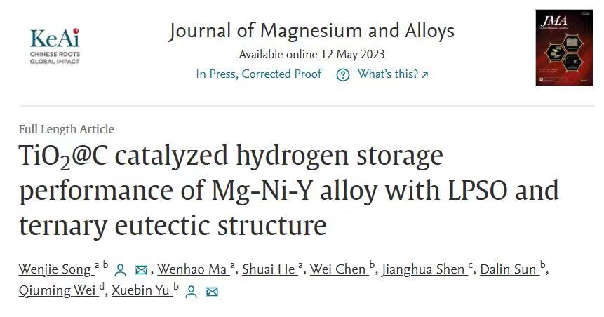 近日,我校機電工程學院宋文杰副教授團隊在鎂合金領域國際頂級期刊Journal of Magnesium and Alloys(1/79,中科院一區(qū),影響因子11.862)在線發(fā)表題為《TiO2@C catalyzed hydrogen storage performance of Mg-Ni-Y alloy with LPSO and ternary eutectic structure》的高水平文章,宋文杰為第一作者兼共同通訊作者,研究生馬文豪為第二作者,陜西科技大學為第一完成單位,該論文的發(fā)表極大地提高了我校在鎂基固態(tài)儲氫材料領域的影響力。