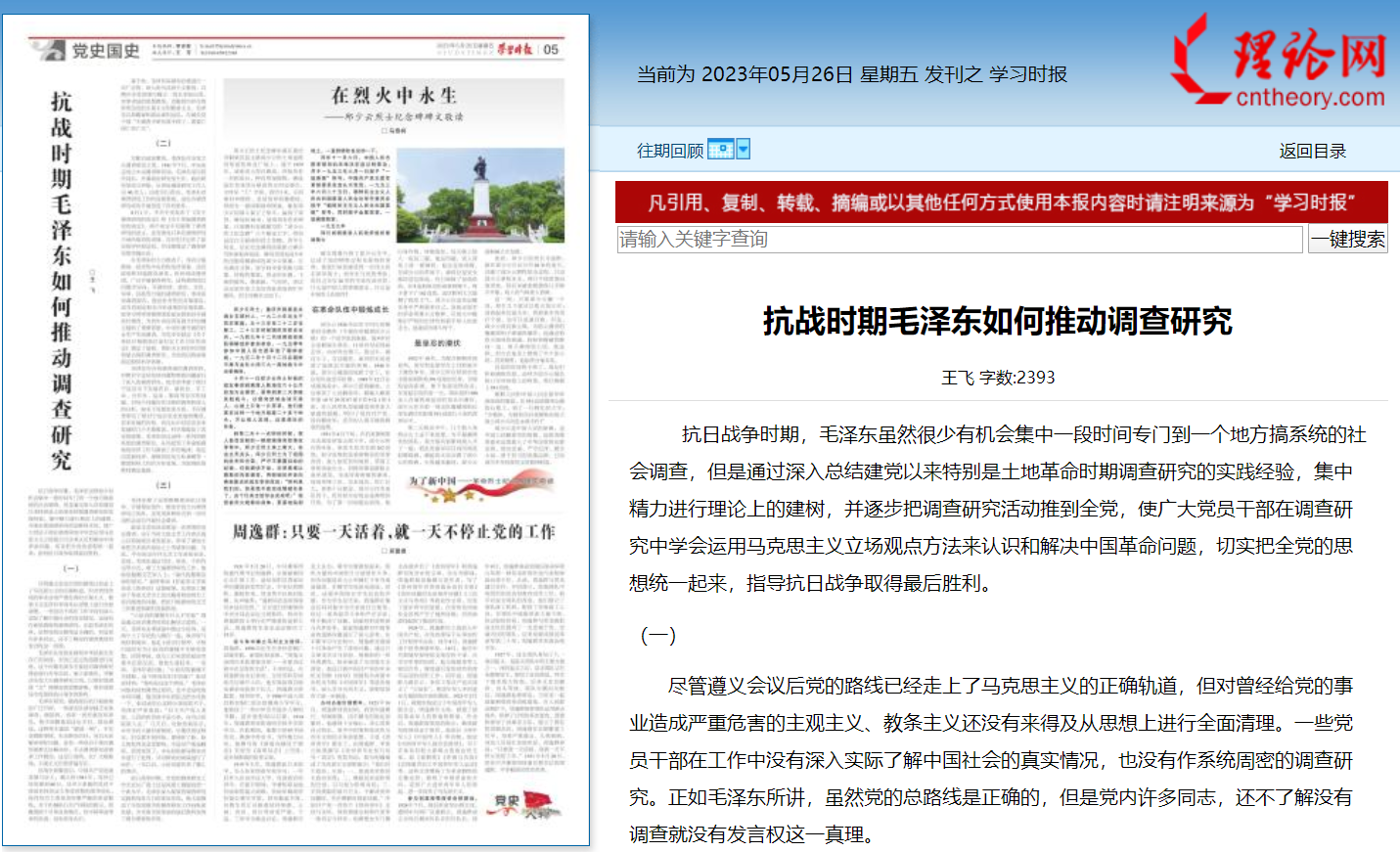 《學習時報》5月26日第5版“黨史國史”刊發(fā)我校馬克思主義學院王飛教授的理論文章《抗戰(zhàn)時期毛澤東如何推動調(diào)查研究》。