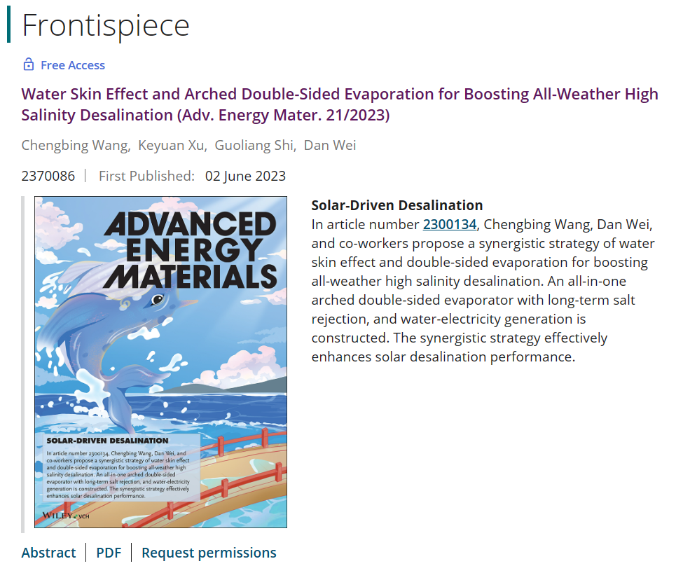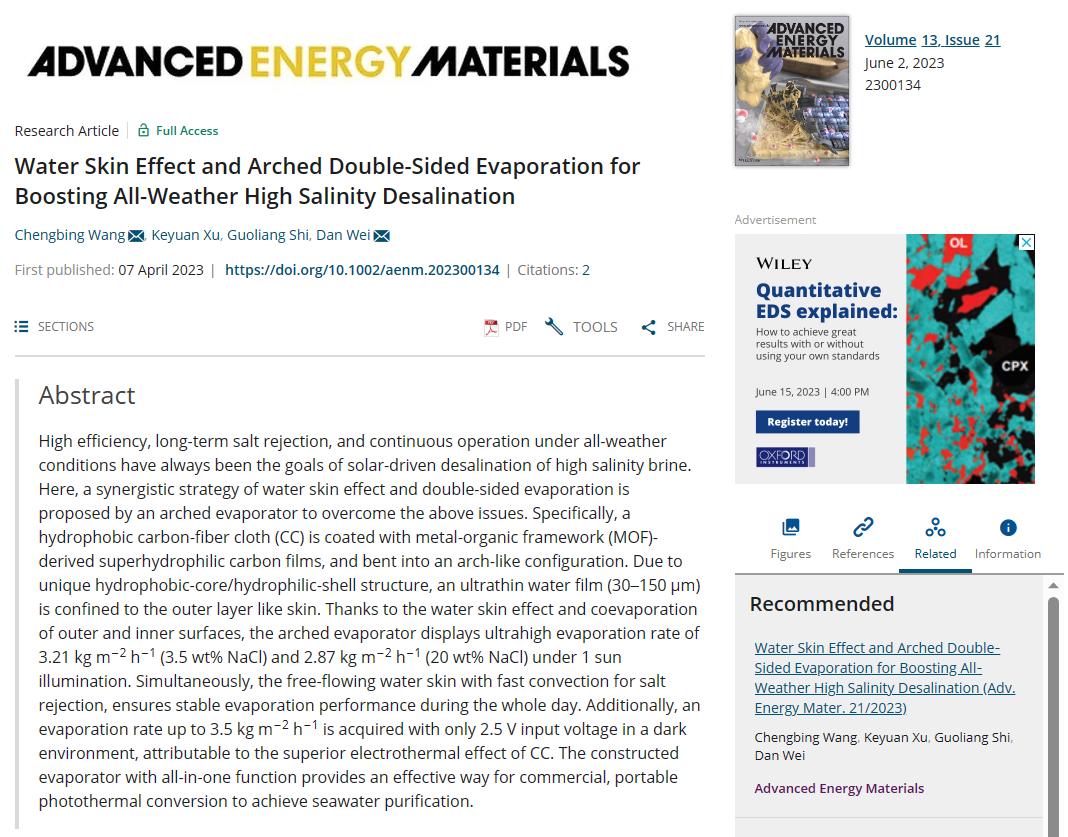 [1] Water Skin Effect and Arched Double-Sided Evaporation for Boosting All-Weather High Salinity Desalination, Advanced Energy Materials 2023, 13, 230013.