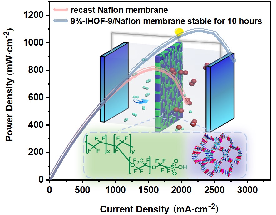 本工作以四(4-磷酸基苯基)甲烷與鹽酸胍為原料,合成了一種基于芳基膦酸鹽陰離子和胍陽離子的具有3D氫鍵網(wǎng)絡(luò)的iHOF材料(iHOF-9)。由于iHOF-9中存在固有的分子間氫鍵,使其具有超高質(zhì)子傳導(dǎo)率。在90°C和98% RH下質(zhì)子電導(dǎo)率可以達(dá)到4.38×10-2S·cm-1。此外,通過將iHOF摻雜到Nafion基質(zhì)中,制備了高性能的復(fù)合膜。H2/O2燃料電池測(cè)試初步研究表明,9%-iHOF-9/Nafion膜在80℃、100% RH條件下放置10 h后,最大功率密度達(dá)到1092.07 mW·cm-2,較重鑄Nafion膜提高33.99%。這項(xiàng)工作將一種超高導(dǎo)電性的iHOF作為一種新興的質(zhì)子交換膜材料摻雜到Nafion基質(zhì)中,為開發(fā)新能源提供了新的可能性。