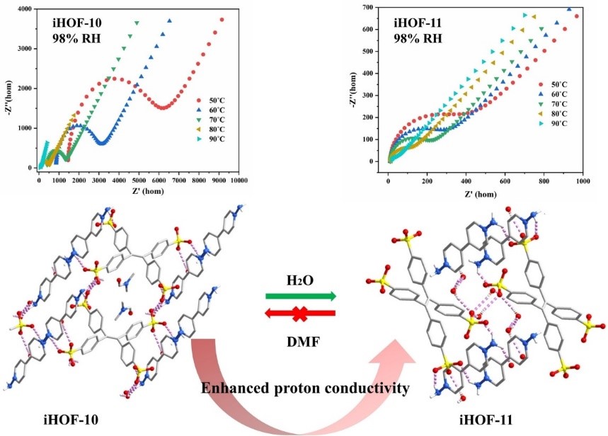 本工作利用以四(4-磺酸基苯基)乙烯和1,1’-二氨基-4,4’-二聯(lián)吡啶進(jìn)行自組裝,既可以使用不同的溶劑合成了iHOF-10和iHOF-11,又可以將iHOF-10浸泡到水中后轉(zhuǎn)變?yōu)閕HOF-11。當(dāng)測(cè)試兩種材料在不同溫濕度條件下的質(zhì)子導(dǎo)電性能時(shí),發(fā)現(xiàn)在低溫低濕條件下iHOF-11的質(zhì)子傳導(dǎo)性能明顯優(yōu)于iHOF-10材料。隨著溫濕度的增加,iHOF-10的質(zhì)子導(dǎo)電率逐漸接近iHOF-11,這是由于溫濕度的增加,水分子進(jìn)去晶體內(nèi)并誘導(dǎo)iHOF-10發(fā)生單晶到單晶轉(zhuǎn)變?yōu)閕HOF-11。水分子進(jìn)入到iHOF-10中,取代了晶體內(nèi)的客體DMF分子并且參與到晶體氫鍵結(jié)構(gòu)的形成,提高了結(jié)構(gòu)的穩(wěn)定性并且提高質(zhì)子傳輸性能。利用HOFs材料的刺激響應(yīng)性,通過單晶到單晶的轉(zhuǎn)變的策略以優(yōu)化材料的質(zhì)子傳輸性能。