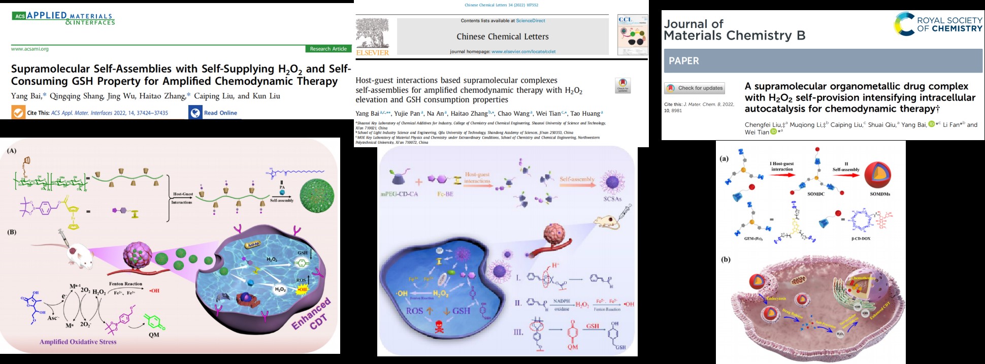 化學(xué)動(dòng)力學(xué)治療(Chemodynamic therapy,CDT)自2016年首次報(bào)道以來(lái),備受科研工作者的關(guān)注,并入選2021年十大前沿?zé)狳c(diǎn),是一種新型特異性治療方式。然而腫瘤內(nèi)H2O2濃度不足、GSH水平高以及酸性不足的微環(huán)境,依然限制著其進(jìn)一步應(yīng)用。前期,課題組發(fā)現(xiàn)環(huán)糊精/二茂鐵構(gòu)筑的超分子體系可有效實(shí)現(xiàn)無(wú)pH依賴(lài)的芬頓反應(yīng)(Journal of Materials Chemistry B. 2022, 10, 8981–8987),易于實(shí)現(xiàn)高效CDT?;诖?,課題組進(jìn)一步通過(guò)功能分子設(shè)計(jì)用于放大腫瘤細(xì)胞內(nèi)氧化分壓,提升H2O2水平、降低GSH水平,致使腫瘤細(xì)胞凋亡,實(shí)現(xiàn)高效的無(wú)藥型特異性CDT治療。相關(guān)成果發(fā)表于ACS Applied Materials & Interfaces.2022, 14, 37424-37435(封面邀請(qǐng));Chinese Chemical Letters. 2023, 34, 107552(ESI高被引論文)。